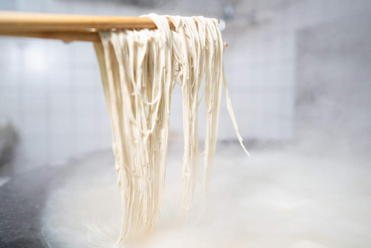 只见捞面师傅不停用工具上下挑弄,最后把下好的面条顺势放入面碗中,有如“鲤鱼背”一般晶莹剔透,形态齐整。