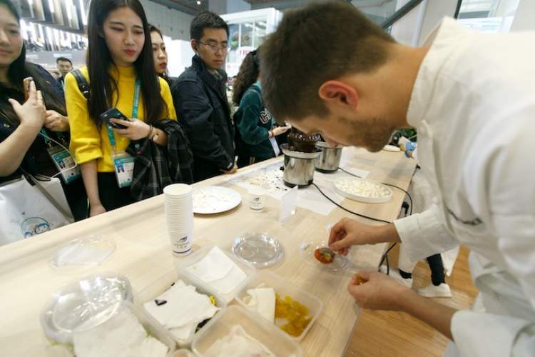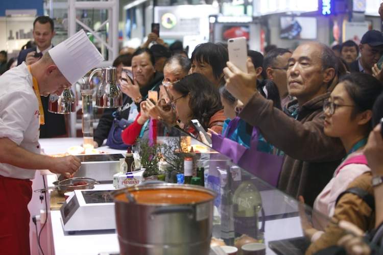 加拿大的牛奶醇香浓郁,日本的小零食精致诱人,澳洲的大螃蟹趴在水缸里挥舞着钳子······各国的展区沿着地毯摆开,说着不同语言的参展商拿出当家产品,邀请观众试吃,品尝异国的味道。
