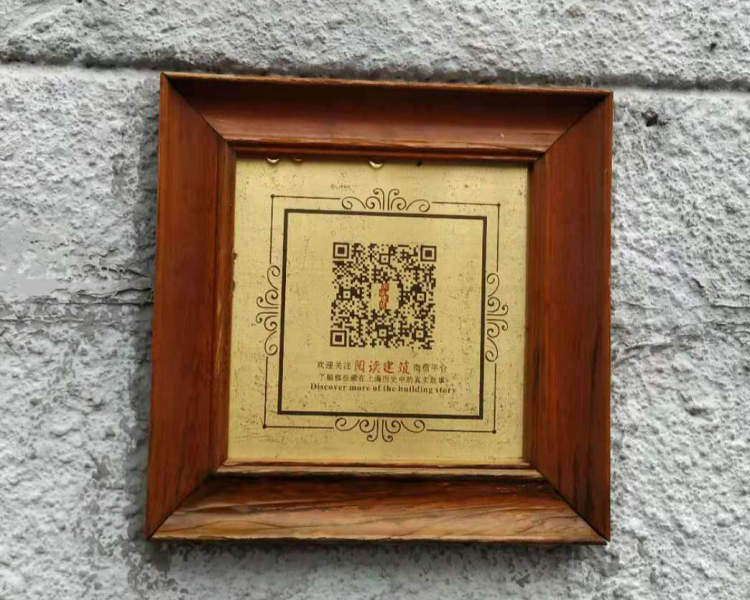 周到君注意到,懋德里弄堂门口有一块嵌在墙上木框里的金属牌子。上面有一个二维码,还用中英双语标注了“欢迎关注阅读建筑微信平台,了解那些藏在上海历史中的真实故事。”