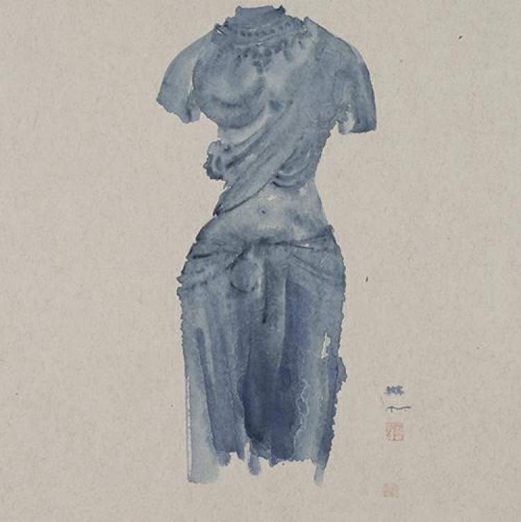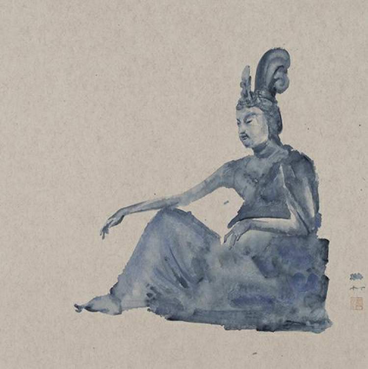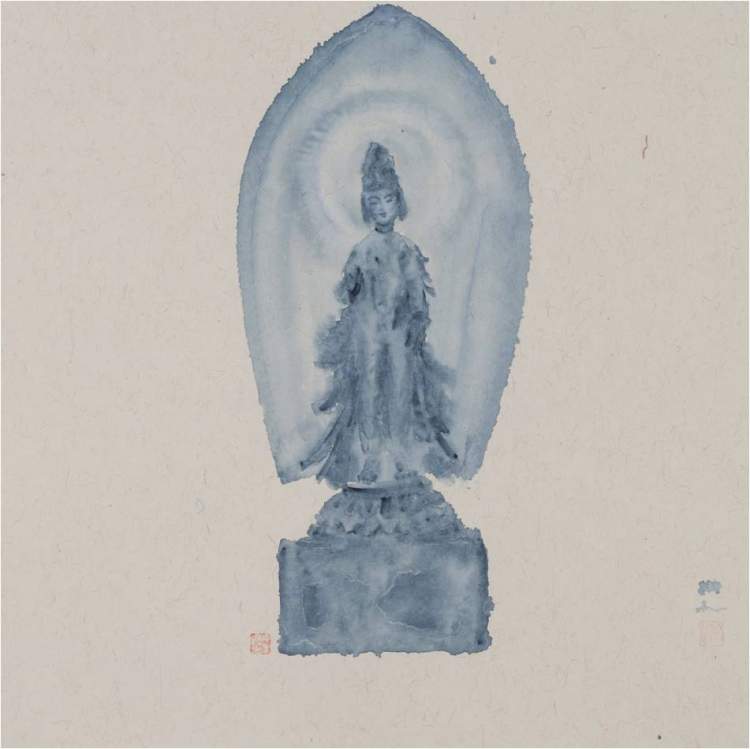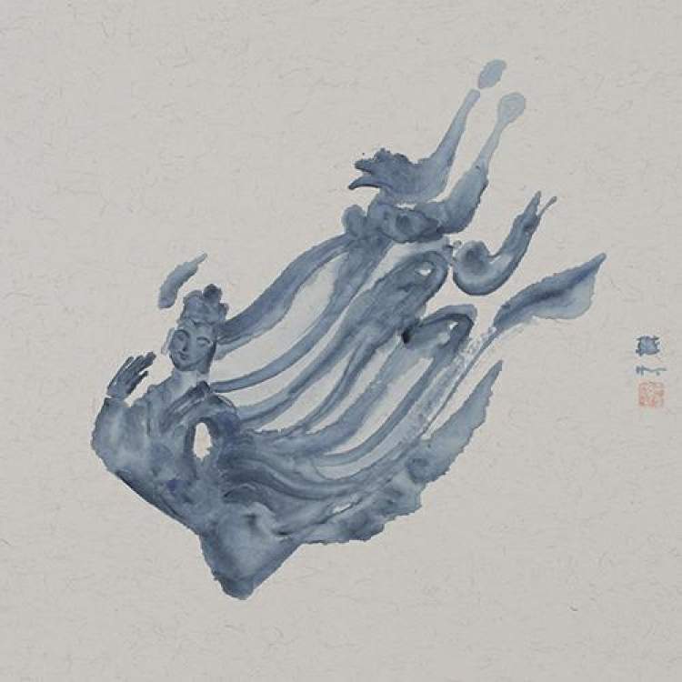 樊帆的“水墨观音”系列带给观众一种异样的审美感受。他的作品以禅味十足的观音等佛像为意象,弥散出浓郁的人生哲思和时空情怀,不抽象而带有深深的悲天悯人。在水墨语言上,他用花青渍染出青花的美感,水墨的氤氲与佛像原有的意象浑然天成,混沌中而有大象。