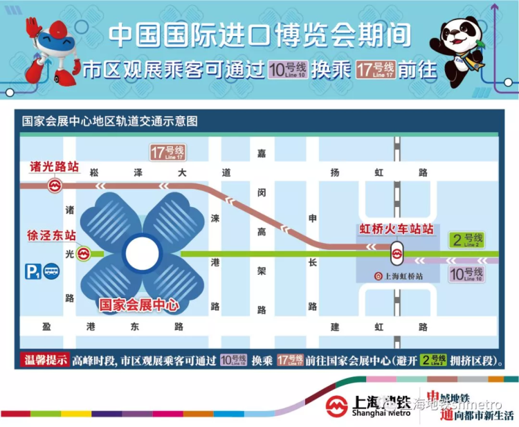 建议观展乘客可以选择乘坐10号线至虹桥火车站站再换乘17号线至诸光路站前往国家会展中心,从而避开2号线人民广场至淞虹路的大客流区段。
