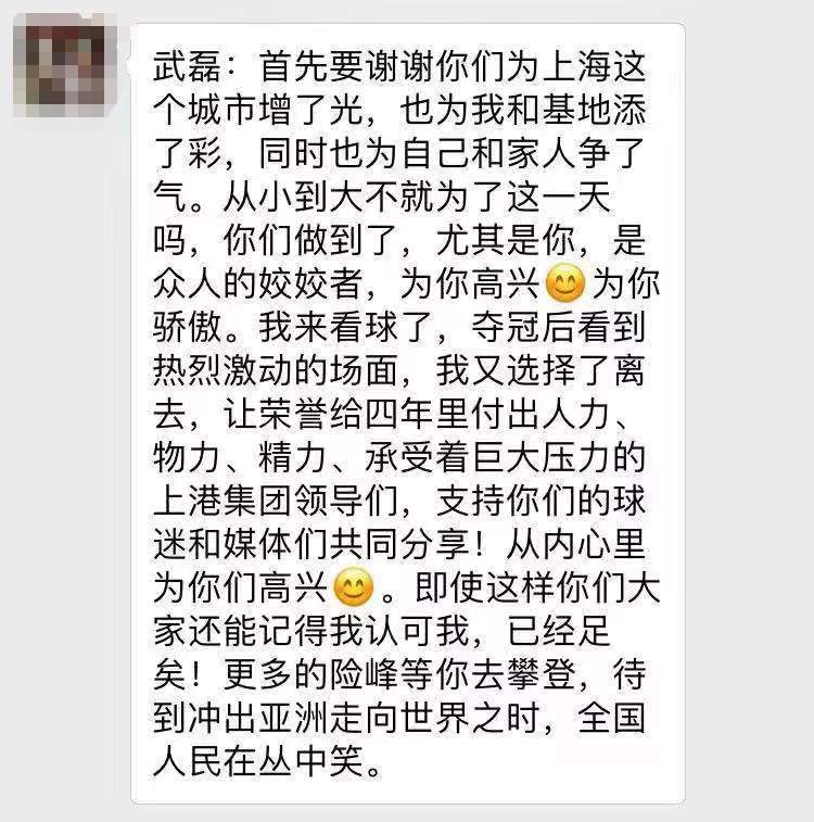 夺冠夜·彩蛋丨猜猜这条微信是谁发给武磊的 2018-11-08 夺冠之夜,武磊收到了一条最有情意、最内心感慨的微信。发这条的,除了他,还有谁?谢谢你,徐指导。 来源:周到上海 作者:俞炯 赞一个 (1)