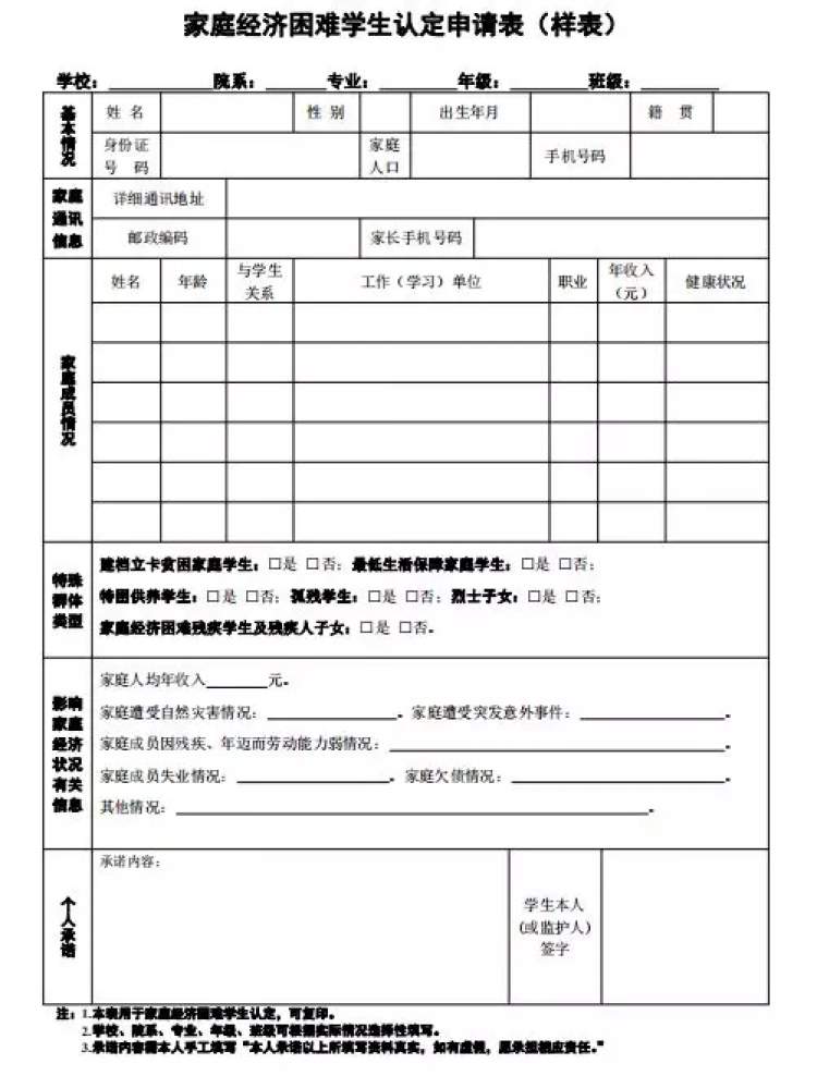 (二)个人申请。学生本人或监护人自愿提出申请,如实填报综合反映学生家庭经济情况的认定申请表。认定申请表应根据《家庭经济困难学生认定申请表(样表)》,由省级相关部门、中央部属高校结合实际,自行制定。