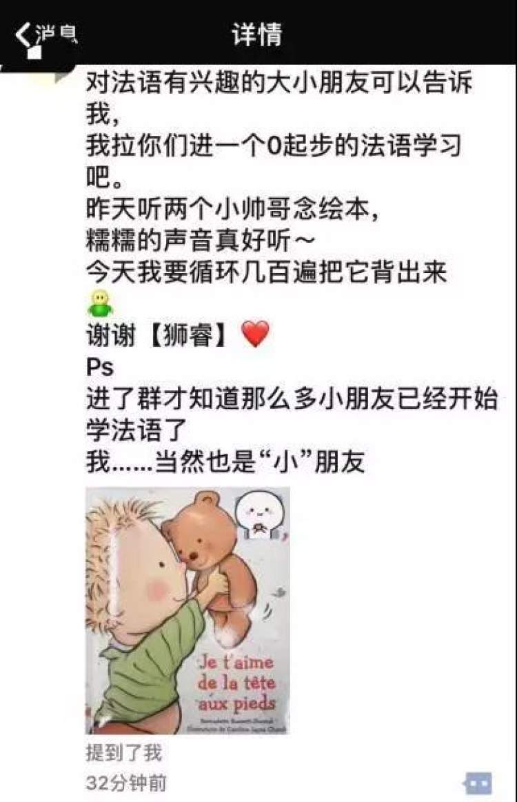 虽然想法不一,但学习劲头却都很足。“每次讲课结束后不到半小时,群里的孩子们就会陆续发来跟读语音让老师点评。几小时后,翻翻朋友圈,发现不少群友已经把听课感想发了出来,于是又吸引了一批家长入群。考虑到群友大都是法语零基础,选的都只是很简单的绘本,仍有认真的家长除了让孩子朗读外,还替孩子做了详细的笔记……”