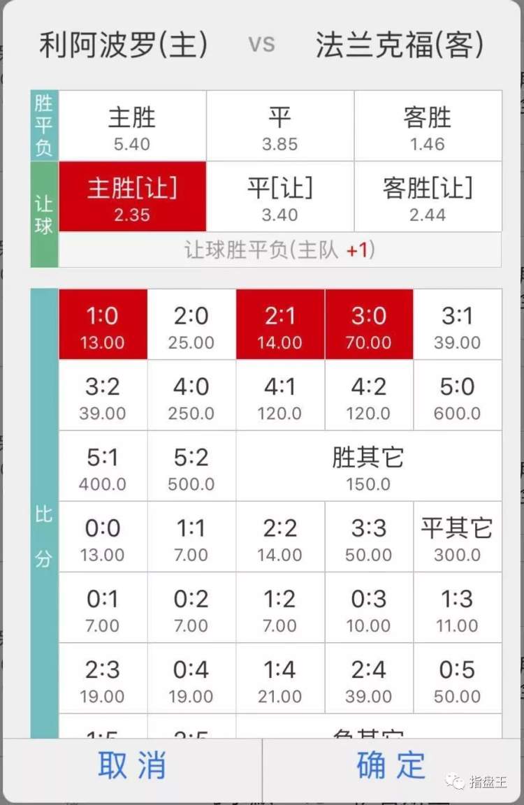005 欧罗巴 01:55 利阿波罗 VS 法兰克福 利阿波罗胜或平;总进球1或3球;可能比分:1:0、2:1、3:0*