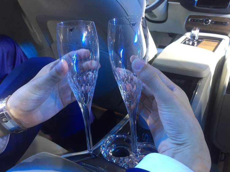 余锋滔滔不绝地介绍这款车:“除了以上功能,在总裁位置旁边打造了娱乐区域,安放了一块加热或者制冷的杯托和杯架,杯架上有两个瑞士皇家御用水晶杯,都是配好的,同时准备了两块小桌板,就像飞机里小桌板的样子;小桌板的后面是小型酒窖,可以同时容纳两瓶750毫升的香槟,打造路上头等舱的感觉。”