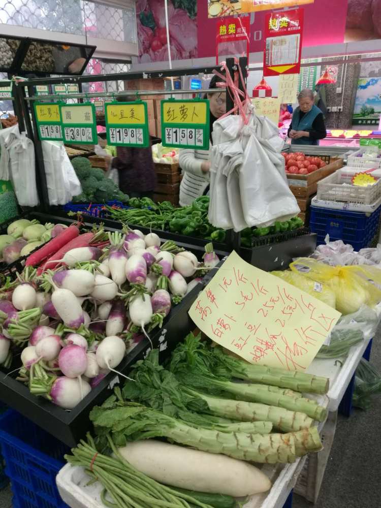 再来说说蔬菜的新鲜情况。秋冬季特别是冬季,气温低,菜从上午放到下午二三点,通常不会出现春夏季(魔都春天很多时间气温很高)特别是夏季那种蔫的情况,即便不将蔬菜放冰箱露天放置,其新鲜程度相差无几,所以拎菜篮子的朋友不用担心下午二三买来的蔬菜不新鲜。