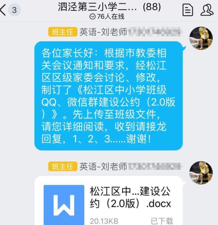 “各位家长好:根据市教委相关会议通知和要求,经松江区区级教委会讨论修改,制定了《松江区中小学班级QQ群、微信群建设公约》。先上传至班级文件,请您仔细阅读……”近日,松江泗泾三小班主任刘老师在班级群发布了一则通知,并上传了一份为规范班级群而制定的《公约》全文。