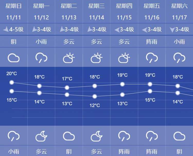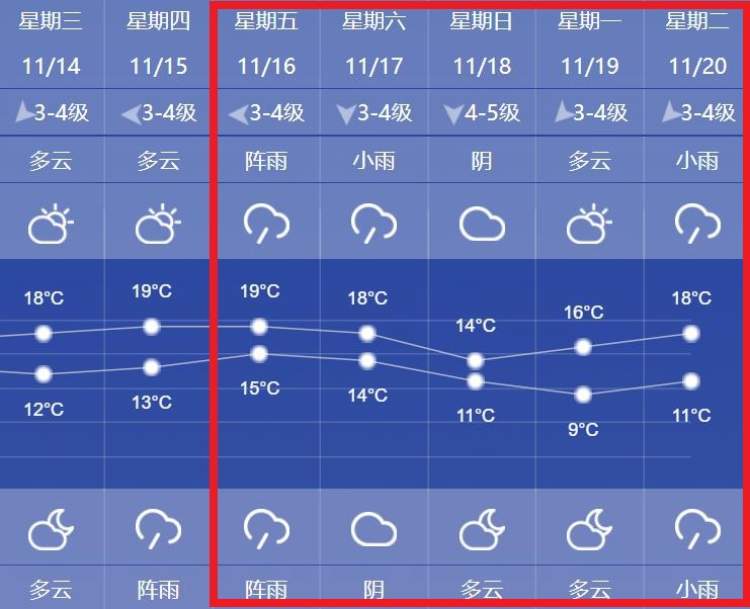 天气趋势可见,下周六最高还有18℃,下周日最高仅14℃。最低气温也不断走低,或再跌破10℃。