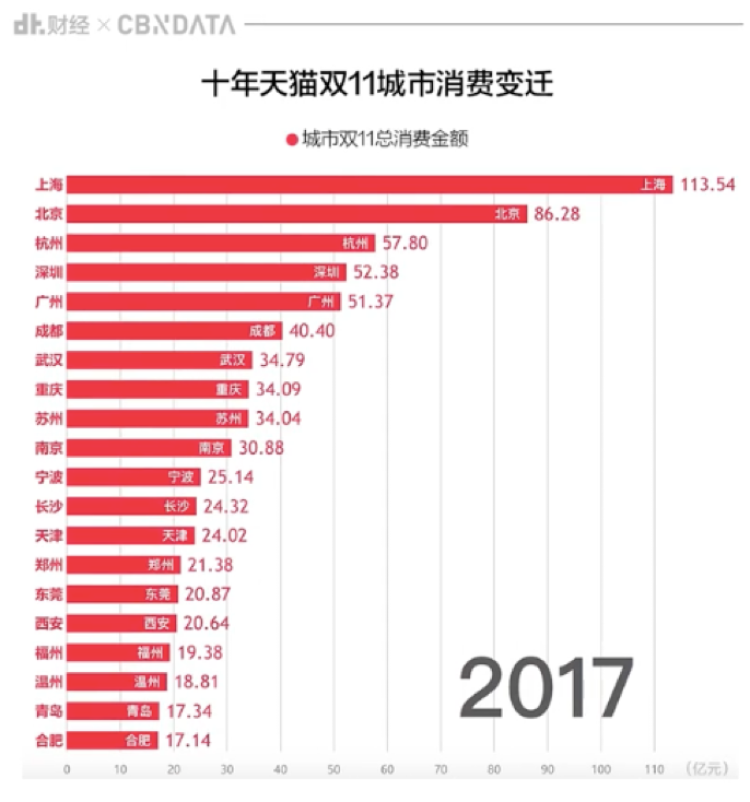 上海成2017年天猫双11城市整体消费力和人均消费力的“双料冠军”。