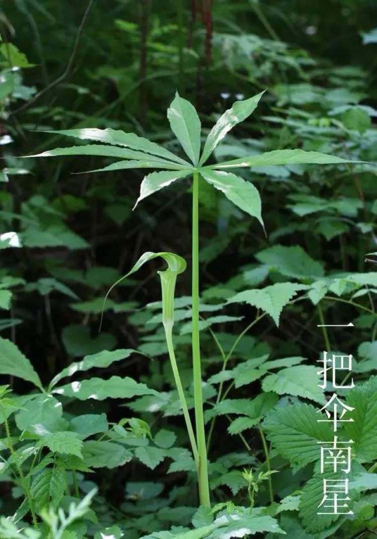 可以说是天南星属中比较奇葩的,叶片仅一枚,但是它的这一枚叶片分裂甚多,辐射状排列,就像一把小伞那样亭亭玉立,秋冬季可以看到它的红果果甚为鲜艳。