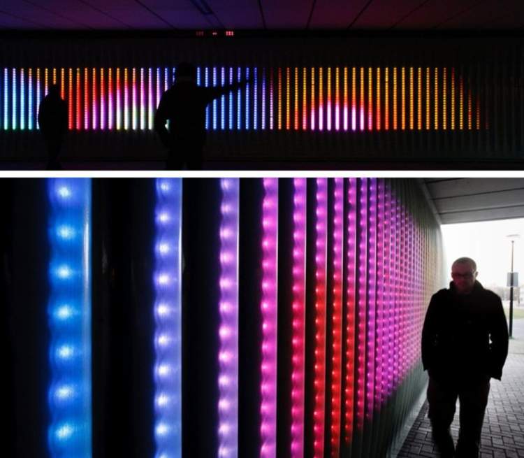 使用说明:采用体感技术对人体动作进行捕捉(在地面指定圆圈范围),通过数据分析传达给灯条,随着人体的动作产生相应的色彩变化与音效呈现。从而使体验者犹如一名交响乐指挥家,所有的灯光听从体验者的指挥,做出相应的变化。