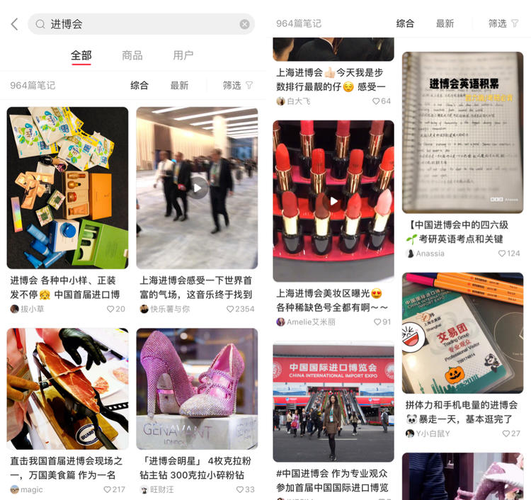 正是因为有了这些“小红薯”(小红书用户的昵称)的贡献,进博会结束后,小红书中关于“进博会”的笔记,已经有了964篇。