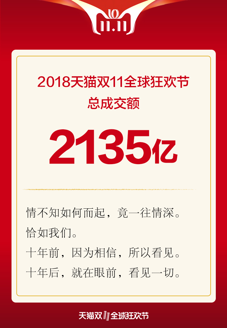 2018天猫双11刚刚落下帷幕。今年天猫双11的最终成交额锁定在2135亿元,首次突破2000亿大关。