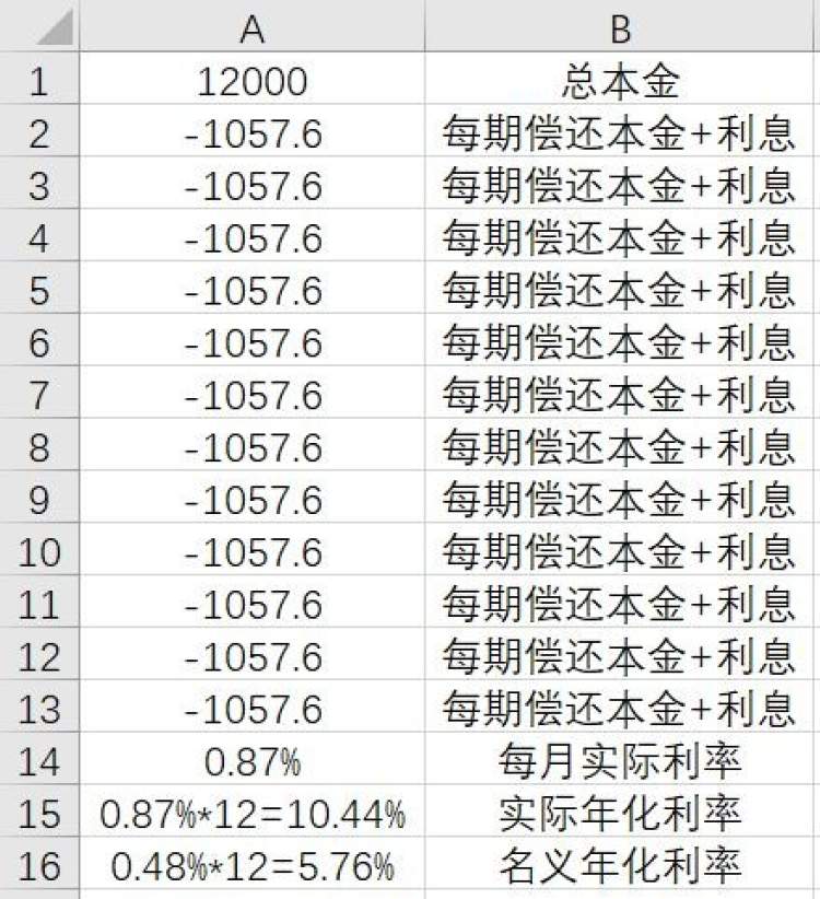 用桑桑的情况来计算,银行预先借款的12000元为正数,之后12期还款1057.6元为负数,可以算出IRR为0.87%。那么,实际年化利率应该是IRR*12=10.44%。比名义年化利率5.76%差了将近一倍,这就是桑桑实际支付的隐性成本。