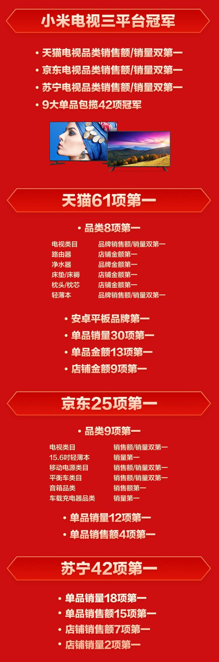 值得注意的是,在天猫、京东和苏宁三大平台,小米电视包揽了电视品类的销量&销售额双冠军,9大单品包揽42项冠军。此外,小米IoT智能硬件及生活消费品拿到了72项品类和单品冠军。业内人士表示,作为“AI+IoT”领域的领头羊,小米在双11的出色表现代表了“AI+IoT”智能硬件的消费趋势,是行业判断市场成熟度的风向标。
