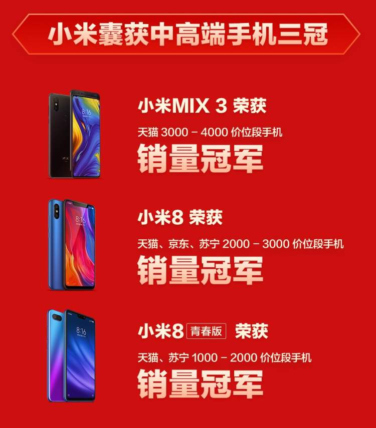 本次小米双11,小米MIX3、小米8和小米8青春版拿下从高端旗舰到中端,手机3大主流价格段销量冠军。小米MIX 3获得天猫3000-4000元价位段销量冠军,小米8在天猫、京东和苏宁稳居2000-3000元价位段销量冠军,小米8 青春版在天猫、苏宁夺得了1000-2000元价位段销量冠军。这表明小米成功站稳了高端手机市场,优化产品组合、持续提升高端机型市场占比的策略取得了明显成效。