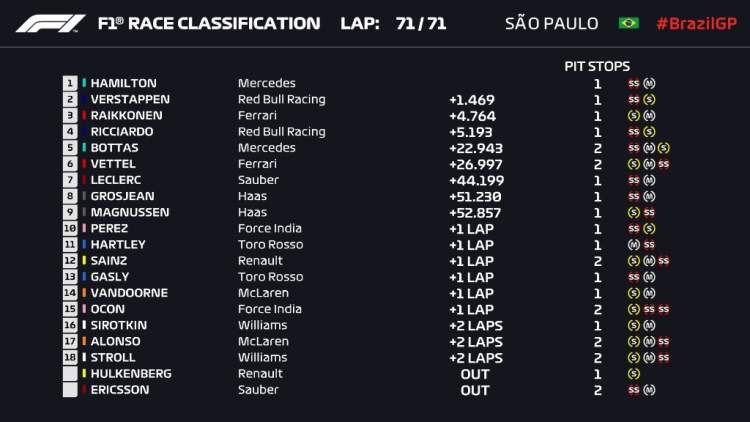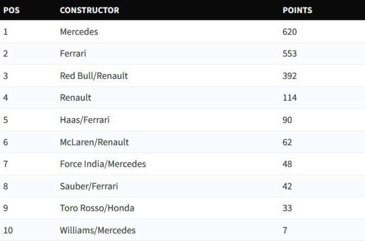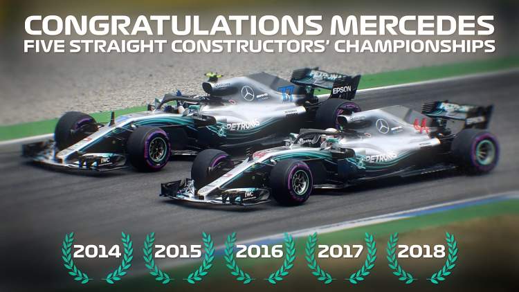本站过后,梅赛德斯车队的积分达到620分,领先第二名法拉利车队67分,今年只剩下阿布扎比最后一站比赛,法拉利已无法超越梅赛德斯,因此梅赛德斯车队提前一站锁定2018赛季车队总冠军,摘得五连冠。汉密尔顿已经在上一站加冕了本年度车手总冠军。梅赛德斯由此连续五年包揽车手和车队双冠。