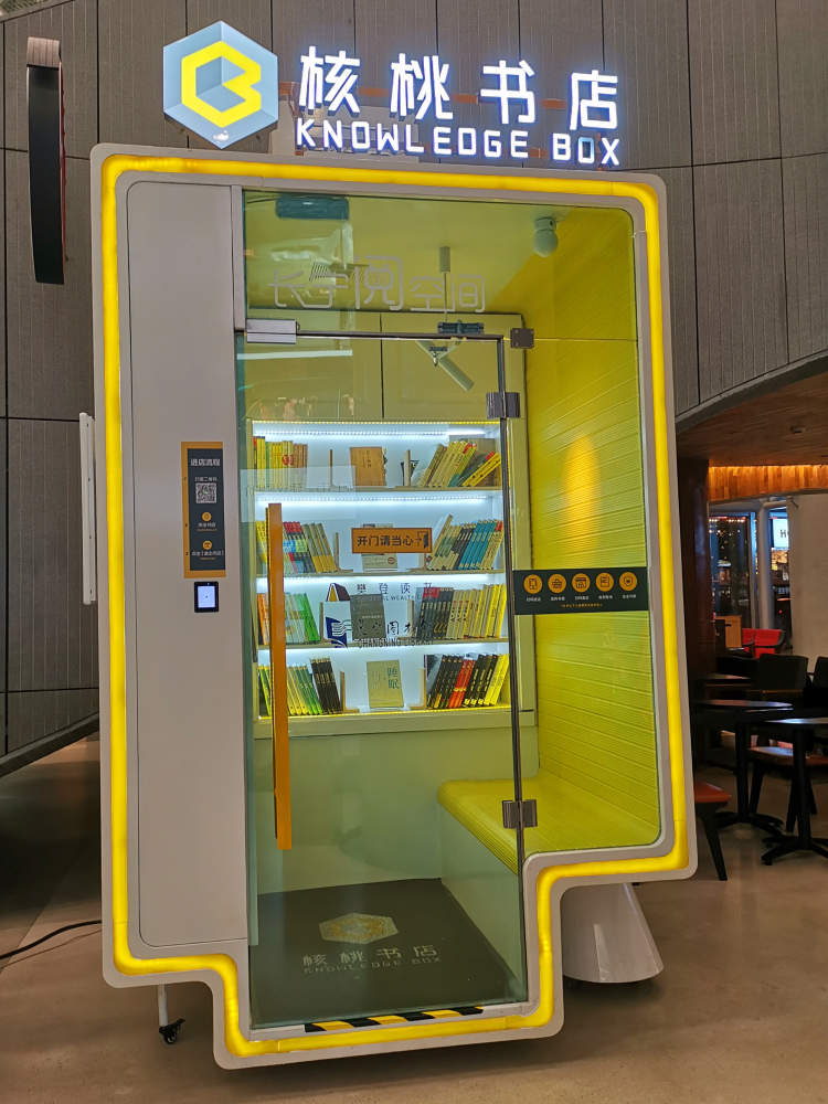 这家迷你无人书店叫核桃书店,高约3米,整体以白色和黄色为主色调。整个书店的面积不足3平方米,只能容纳1-2人,可能是长宁最小的书店了。而且从入店、选书、购书到结账,全程“自理”,看来连传统书店都开始走上“无人系列”道路。