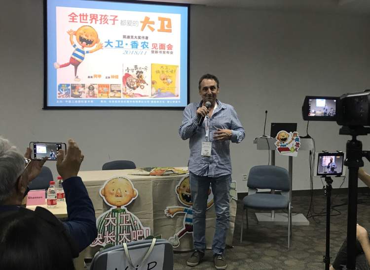 享誉国际绘本界的凯迪克奖获得者、美国绘本作家、画家大卫•香农,此次也来到童书展现场,与大小读者展开亲密互动,分享《鸭子骑车记》《大卫,不可以》《小学霸的一天》等作品背后的创作故事。活动吸引了众多家长和孩子,现场被挤得水泄不通。