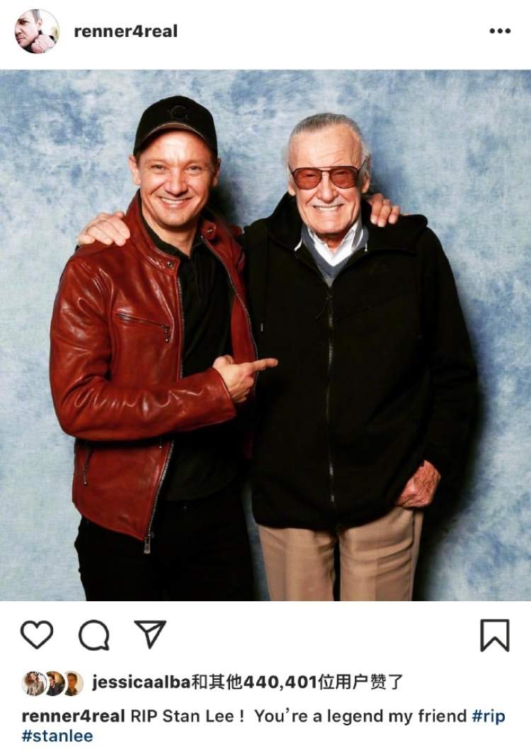 “鹰眼”杰瑞米·雷纳:“安息吧,斯坦·李。你就是传奇。”