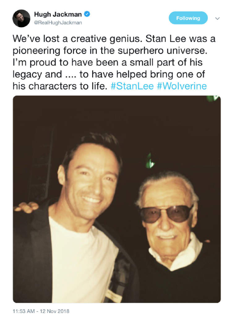 “金刚狼”休·杰克曼说:“我们失去了一个有创造力的天才。斯坦·李是超级英雄世界的先锋。我很自豪成为了他一小部分的遗产……并帮助他的一个角色成为现实。”