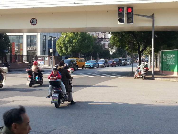 图为今天上午早高峰期间,凯旋路、吴中路口一位骑电瓶车者驮着孩子闯红灯。