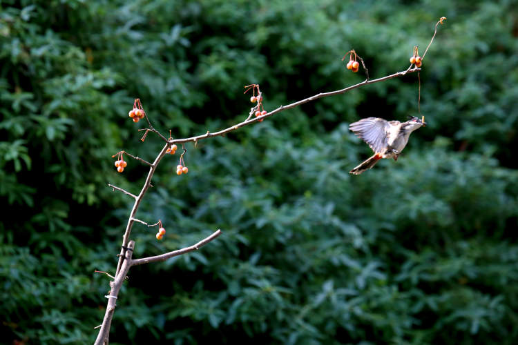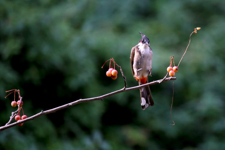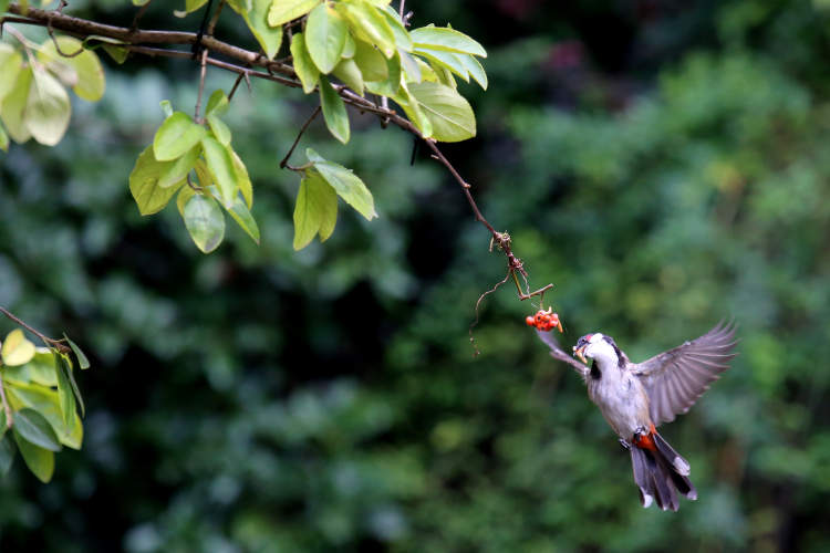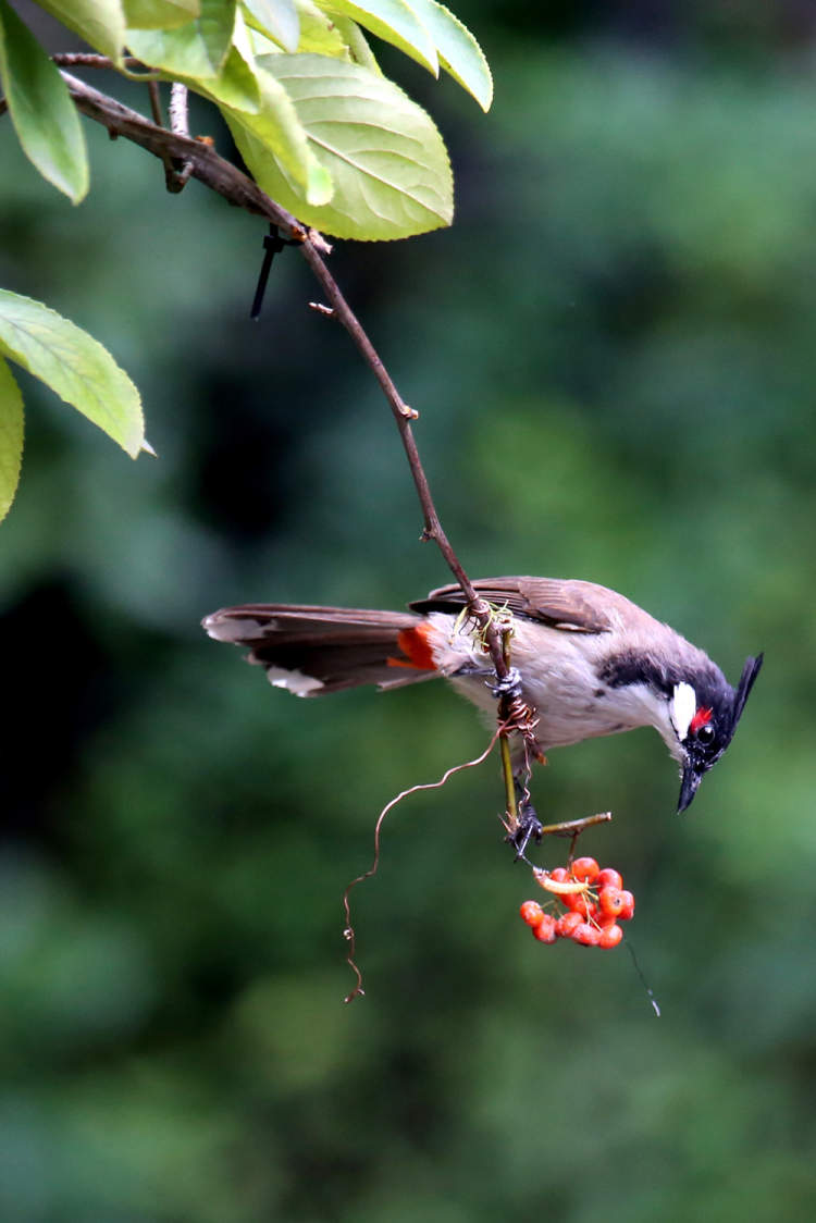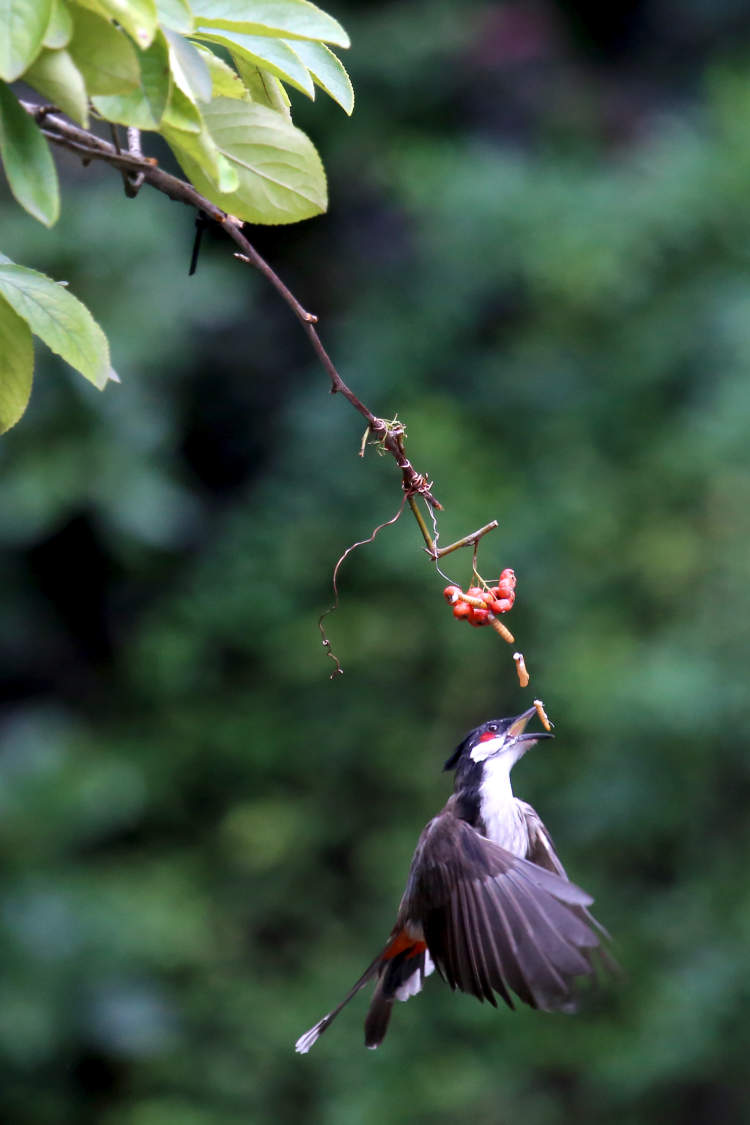 大约十几分钟后,就有一只红耳鹎蹦蹦跳跳地靠近海棠树,然后轻轻跃上海棠的枝头,叼走虫子,立即飞走。