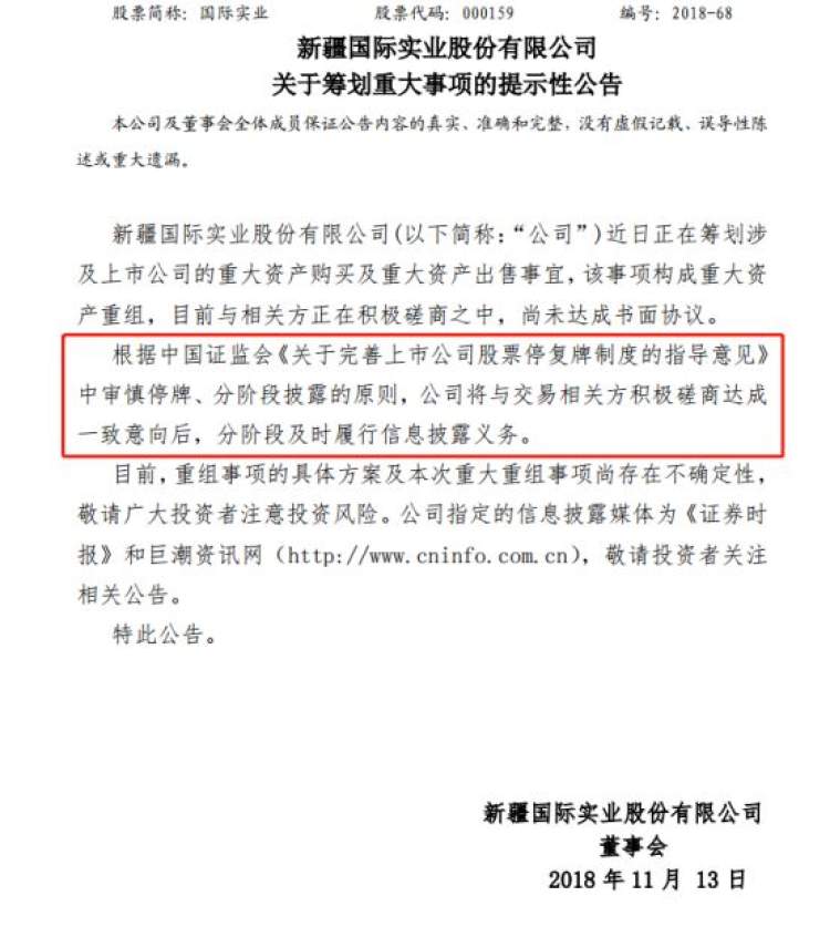 11月12日晚间,国际实业公告,近日正在筹划重大资产重组事项,根据证监会的停复牌新规,公司将分阶段及时履行信息披露义务,股票不停牌。这是停牌新规后,首家在公告中明确表示根据审慎停牌、分阶段披露的原则未停牌的公司。