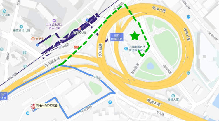 如上图,蓝线红点表示原45路行驶路线和终点站位置,绿色虚线为调整后的路线。周到君利用电子地图的测距工具,原终点站与新终点站之间相距大约500米左右,对于坐车到南浦大桥终点站的社区居民来说,这个距离还是能接受,并不算太远。此外,327路调整后的路线也将与45路一样。