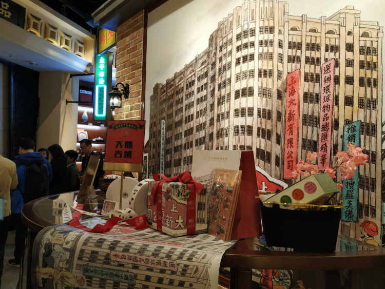 代表们兴致勃勃地看了老式铁盒装的牛轧糖、印着仕女图的雪花膏等伴手礼,参观了摆着三五牌台钟、拉丝玻璃杯、乐口福罐头的老上海物件展区,浏览了绘有昔日大新公司(一百老楼前身)、永安公司外貌的墙画。店内还展示了老上海店招、广告牌、路牌,可以算是一个展示老上海文化的景点。