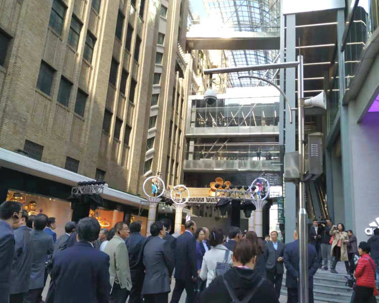 除了连廊以外,一百老楼和东楼之间还加盖了一个高达42米,长80米的透明顶棚,使用PC材质的透明管和实心板,为六合路撑起了一把“透明伞”,为七条连廊遮风挡雨。此次改造还在连廊幕墙、顶棚上加装了灯光设施,led 灯阵会在夜间亮起,通过色彩变幻,营造不同的主题效果。