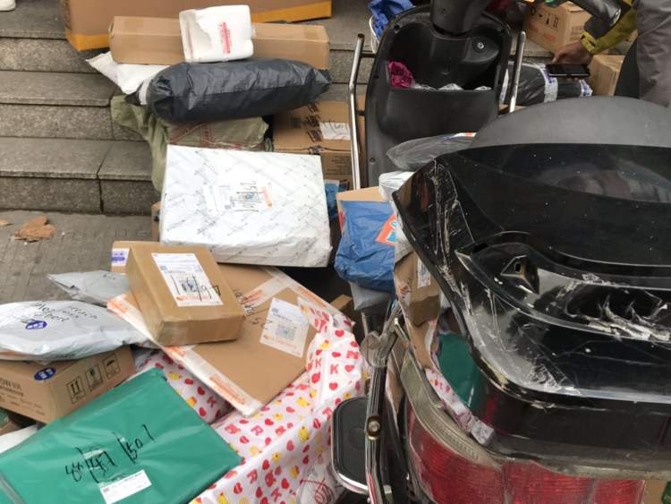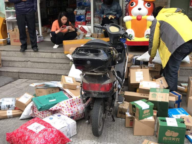 早上10点不到,老江预备的“快递架”上已经有了5、6件快递,“还好,都不大。”老江自我安慰着,但是一个小时不到,陆陆续续又增加了几件快递。到了下午2点,老江的超市门口竟然铺满了快递,老江把他的妻子从仓库叫出来,“一起理理!”