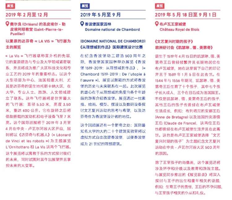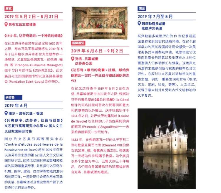2019 年是达芬奇逝世500 周年,也是香波堡这座王家城堡动工建造500 周年。中央-卢瓦尔河谷大区因为云集了一批出自文艺复兴时期的城堡而闻名。卢瓦尔河谷曾经是法国国王的主要居住地。文艺复兴时期,这些国王从意大利邀请了一批工匠、花园设计师、建筑师、艺术家,他们通过建造城堡、教堂、私人公馆、花园等为卢瓦尔河谷带来了一场艺术、建筑和科学的历史性革新!