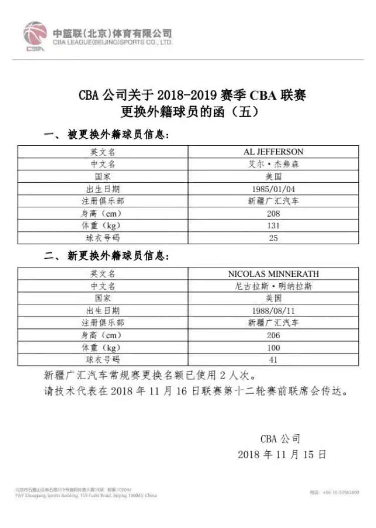 北京时间11月15日,cba公司官方宣布,新疆男篮已经用上赛季效力上海队的明纳拉斯替换艾尔·杰弗森。明纳拉斯将代表新疆队出战接下来的cba联赛。