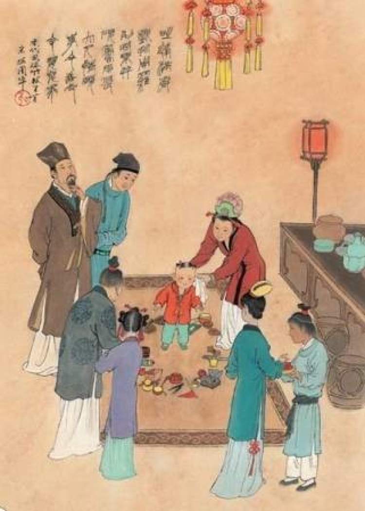 桌上通常会摆上书、钢笔、算盘、秤、葱、玩具、红包等各类物品,任小囡自由选择抓取,以此预测小囡日后的前途、性格、志向和兴趣。小小的“抓周”为的就是讨个好口彩,同时也寄托了长辈对晚辈的美好祝愿。