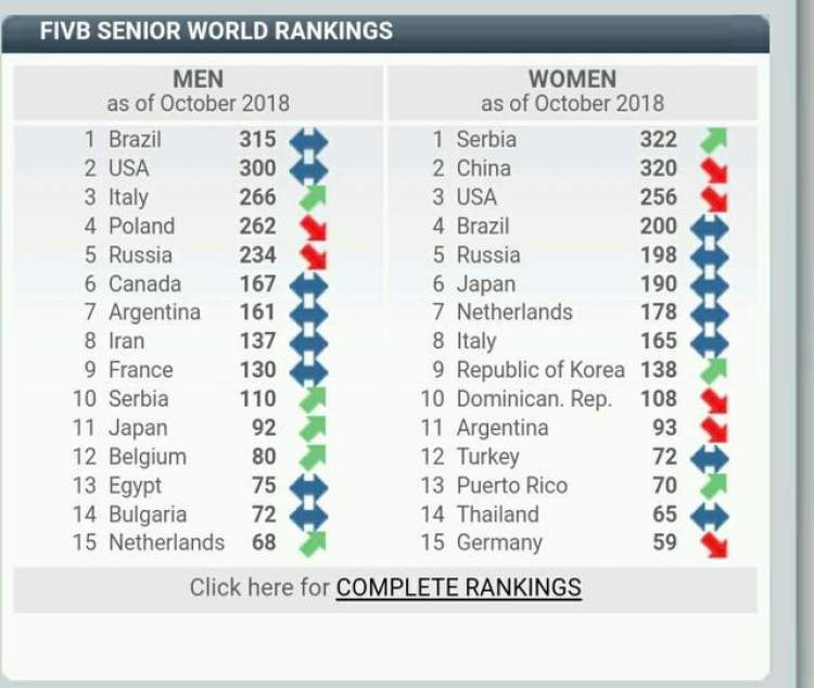 北京时间11月17日,在国际排联最新公布的世界排名榜单上(截止2018年10月),中国女排以320分高居榜首,位居第二位,排在塞尔维亚女排之后。