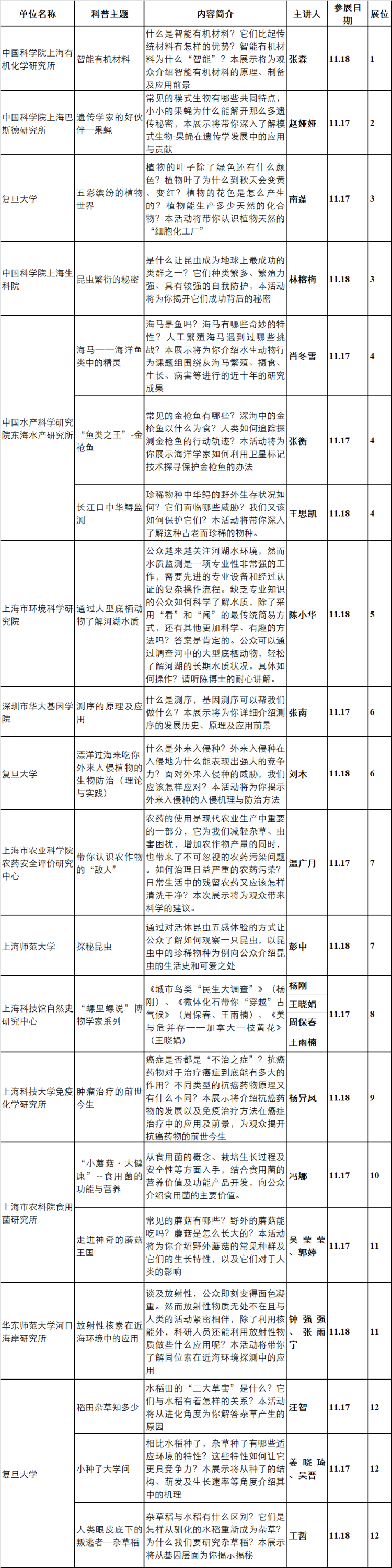 作为“第四届上海国际自然保护周”亮点活动之一,上海自然博物馆(上海科技馆分馆)第三届“与科学家面对面”活动于11月17日-18日在地下二层中庭开展,来自全国各地13家科研单位的26位青年科研人员为公众带来了科普饕餮大餐。
