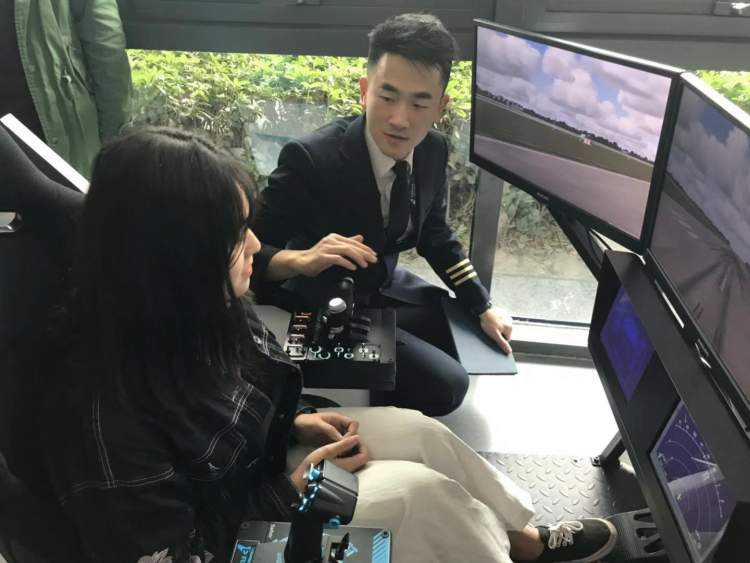 南航飞行员王欣带着一群大学生们“开着飞机”完成飞机的起飞、降落等操作。