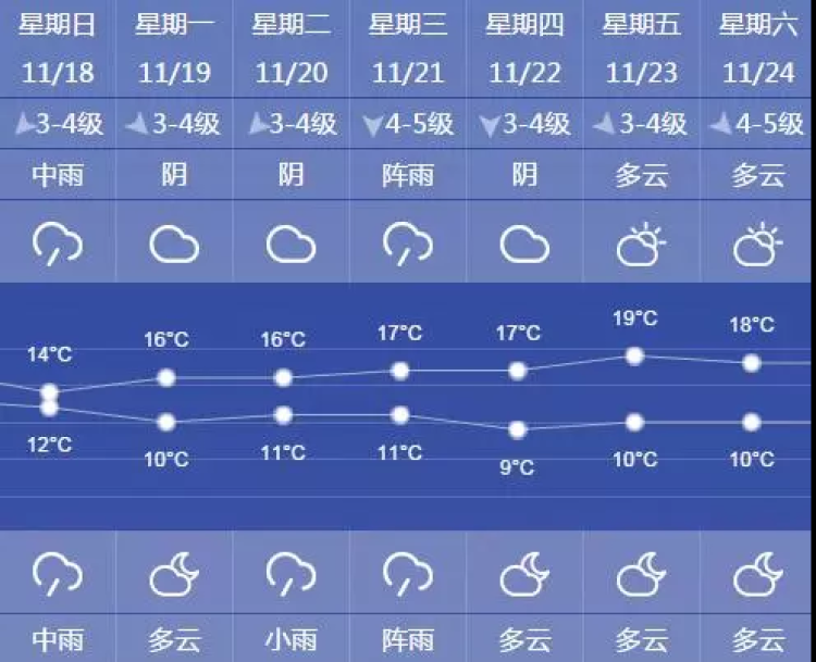 值得注意的是,尽管最高气温在16-19℃徘徊,但下周的最低气温将再下一个台阶,主要稳定在9-11℃。魔都深秋的夜,将越来越凉了。