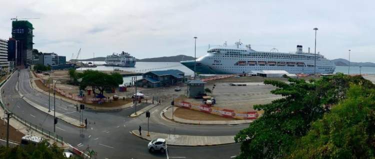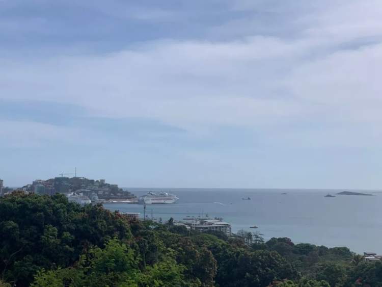 △站在这里,可以远远望到两艘邮轮。靠左边的是珍宝号,右边是探索者号。(央视记者包佳节拍摄)