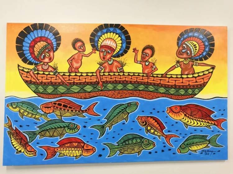 △注意到没有,会场的墙上挂着这幅当地的画作,主题是船。(央视记者杨立峰拍摄)