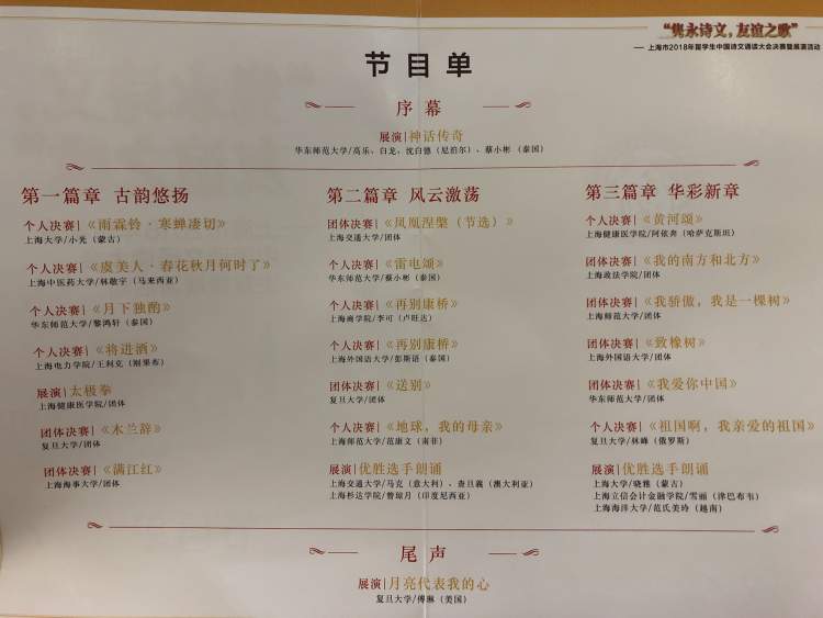 今天,隽永诗文,友谊之歌——上海市2018年留学生中国诗文诵读大会决赛在复旦大学举行。18个节目从37个国家的150余名留学生中脱颖而出,悠扬声韵演绎了中华经典诗文的隽永清韵。