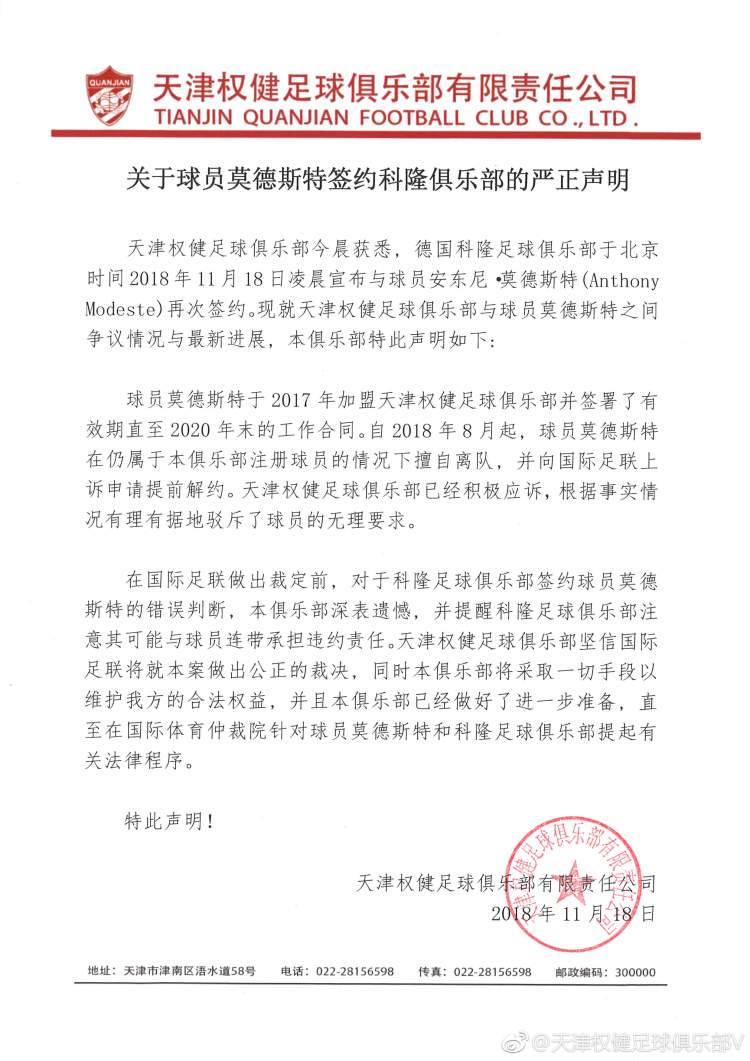 闹剧没完!权健发声明质疑科隆签约莫德斯特 等待国际足联裁决 吴铮泽 2018-11-18 来源:周到上海 今天凌晨,德国科隆足球俱乐部宣布与莫德斯特签约。而在今天中午,天津权健发布《关于球员莫德斯特签约科隆俱乐部的严正声明》,表示莫德斯特与球队的合同尚未到期,属于擅自离队,并提醒科隆足球俱乐部可能连带承担违约责任。天津权健俱乐部表示,将采取一切手段维护俱乐部的合法权益。 声明全文如下: 来源:周到上海 作者:吴铮泽 赞一个 (0)