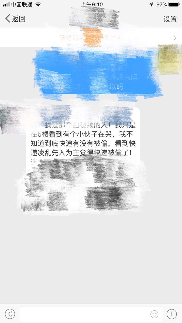 周到君尝试在微博上联系拍视频的目击者后,这位目击者表示,“我只是在5楼看到有个小伙子在哭,我不知道到底快递有没有被偷,看到快递凌乱先入为主觉得快递被偷了!”