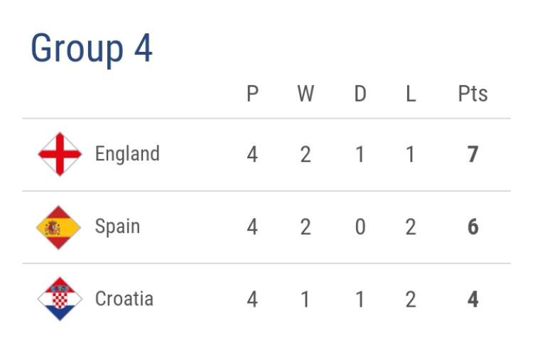 北京时间11月18日晚,欧国联A级第4小组,英格兰坐镇温布利球场2比1逆转击败克罗地亚,获得小组头名晋级决赛阶段,克罗地亚排名第三,世界杯亚军从欧国联A级降级。上半场比赛斯特林和拉什福德先后错失单刀,凯恩错失良机。下半场比赛克拉马里奇破门,林加德补射破门将比分扳平,凯恩铲射破门将比分逆转。英格兰报了世界杯半决赛落败的一箭之仇。最近5场各项赛事,英格兰4胜1平保持不败。