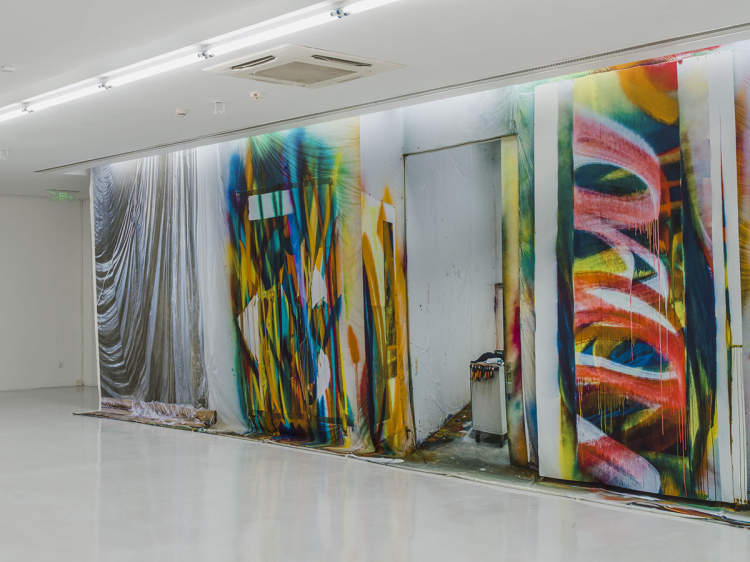 巨大的丝绸幕布上面印有格罗斯位于柏林工作室的照片——喷枪所在的工作室间全景。这些图像揭示了在另一个地方存在过的痕迹,将记忆与回想的情境带入展览,在绵延的展览中藏着时间的空隙。