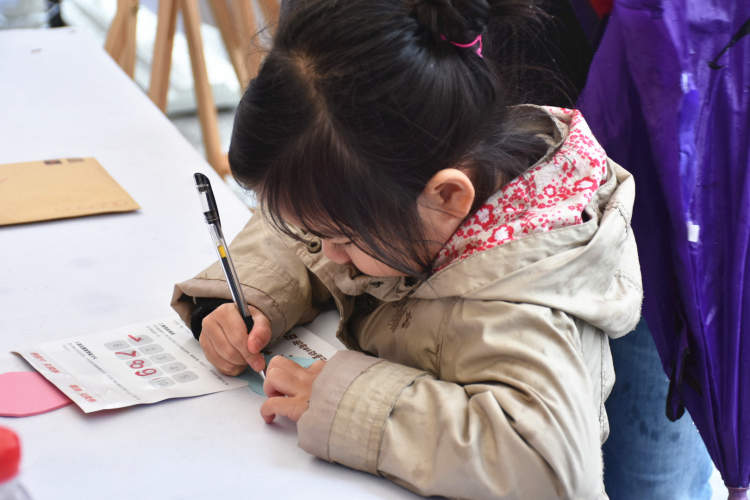 看,光大信用卡中心摊位前聚集了一大群小朋友,他们都埋头认真地写下对家人的祝福,“爸爸妈妈我爱你”“我们是幸福的一家人”“开心快乐每一天”……一张张写满祝福的爱心卡片在阴冷的雨天,传递了一份温暖。