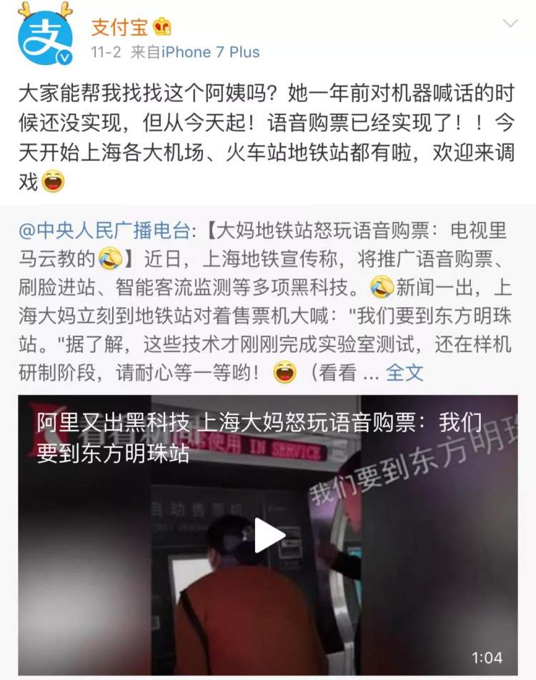 支付宝也在官方微博上寻找那位“怒玩语音购票”的大妈