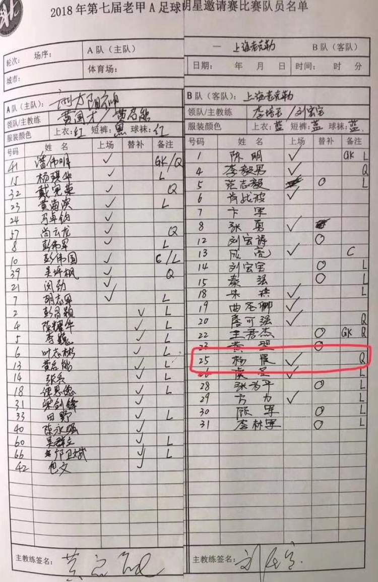 昨天晚上,涉事球员杨晨在微博上发声:“因为上海队特殊原因,我参加老甲A之前就得到组委会方方面面的同意,我也没有造假,用的真实年龄真实身份参赛的,比赛前还得到组委会和裁判监督确认同意我参赛,直到比赛结束,广州队输了,广州队才不认之前的承诺,这直接对上海对老克勒足球俱乐部和我造成了严重的影响,我们也没有故意隐瞒事实,我们都有各方面同意我参赛的录音和文字证据……”